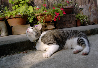 「あれは何だ?鳥だ!飛行機だ!セミだ〜!」 今年も朝からセミを求めて庭で狩りを勤しむすーたんです。 上ばっかりみてると首が疲れる様で、ちょっとした段差を利用して枕代わりにしております。 「これ、まねしてもいいよ。」 …誰がするんでしょうかね?